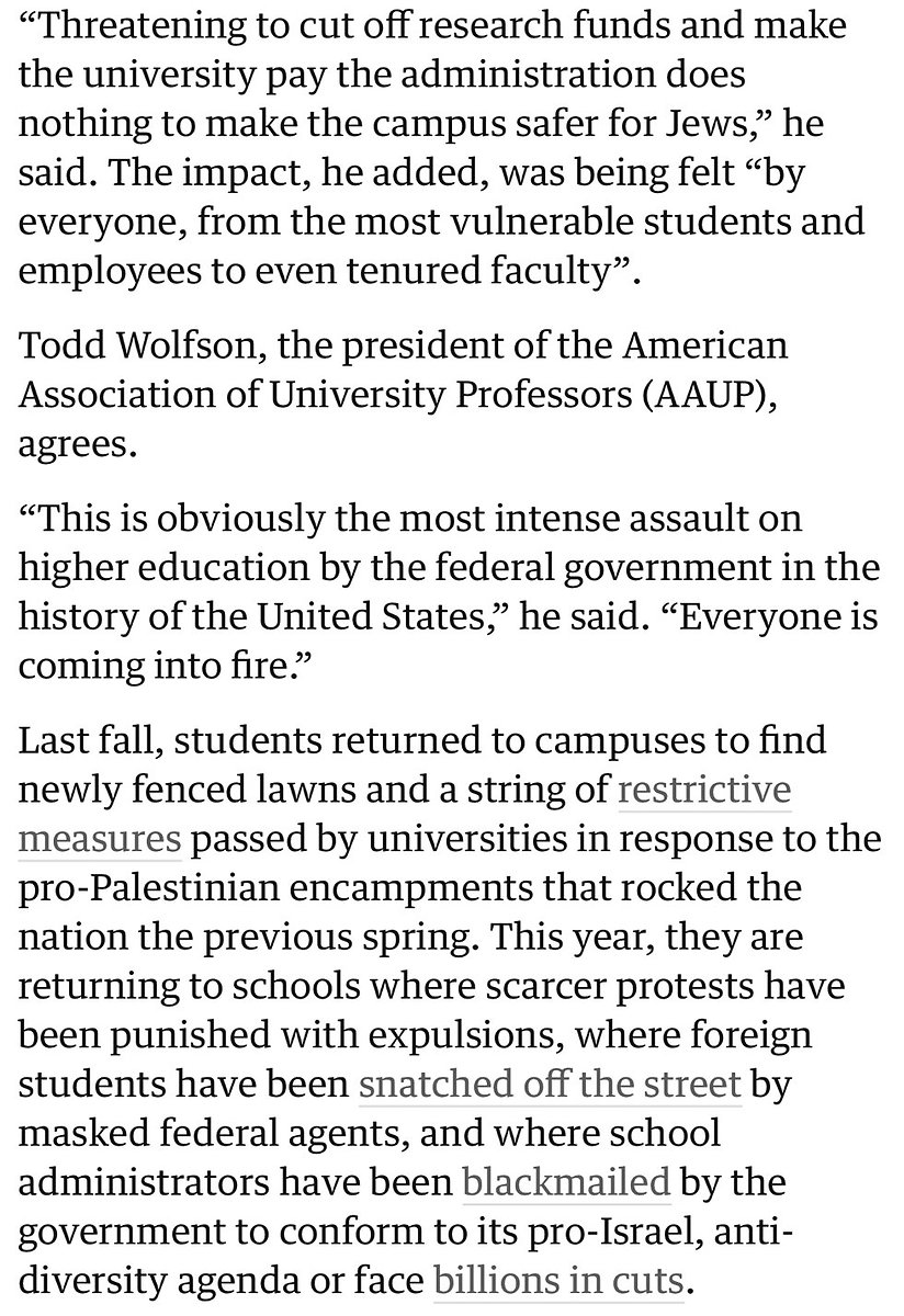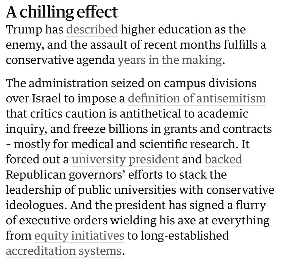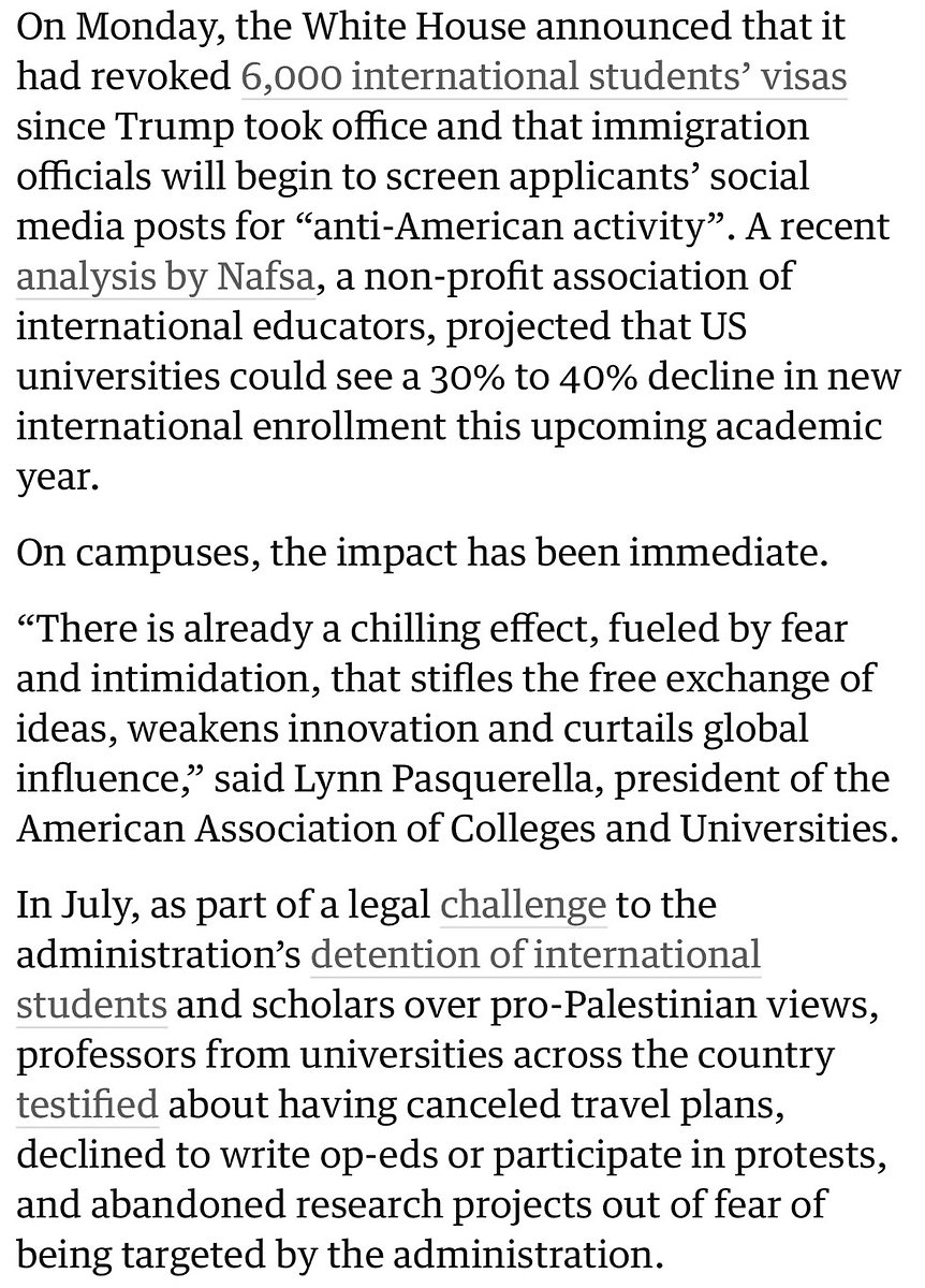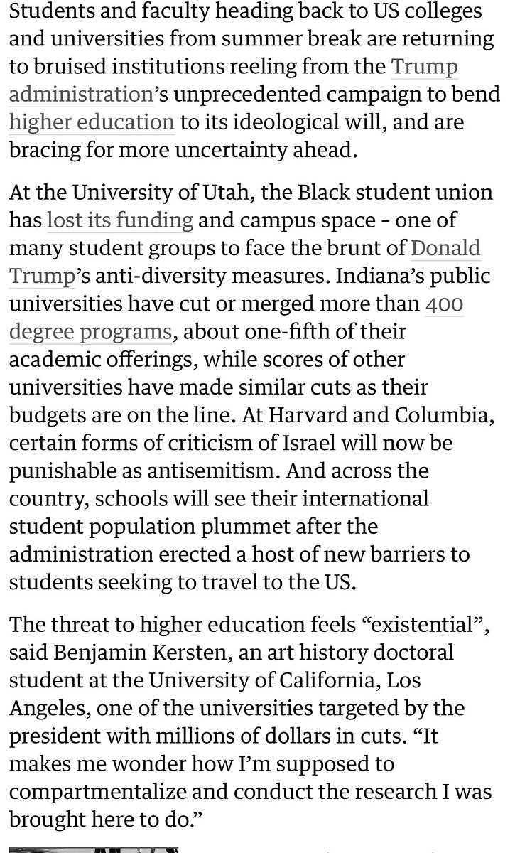 - b. The Guardian 8-3-25: 'Everyone is coming into fire' - students return to US campuses bruised and changed by Trump's assault
