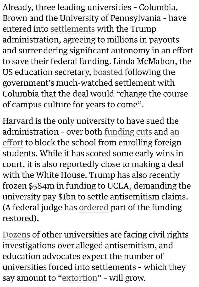 - l. US universities' settlements with Trump 'will only fuel his authoritarian appetite'
